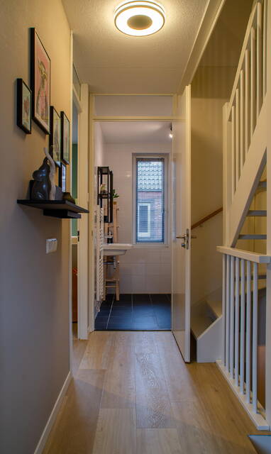 Tot slot vindt u in de hal de trap naar de eerste verdieping en de doorgang naar de woonkamer.