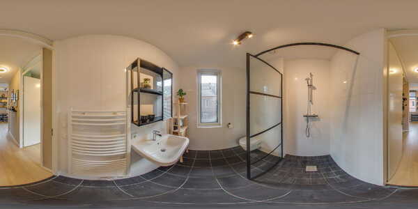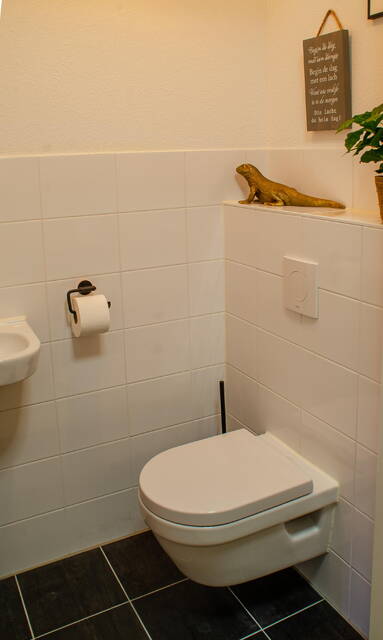 De badkamer is geheel betegeld en uitgerust met een wastafel, douche en toilet. Een plek waar u heerlijk kunt ontspannen.