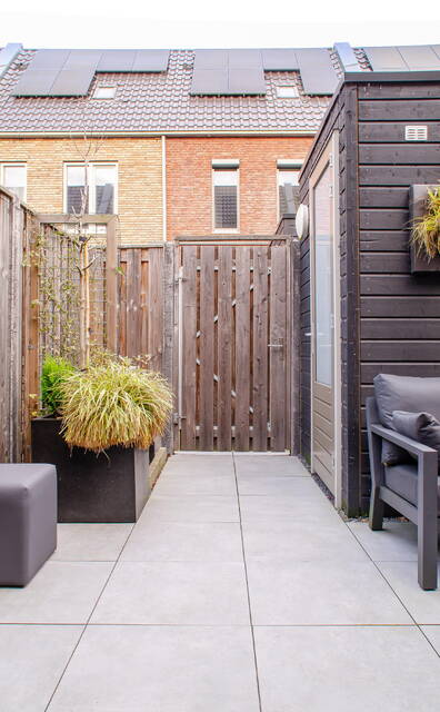 Achter in de tuin staat een houten berging, ideaal voor het stallen van de fietsen en het bergen van het (tuin) gereedschap. Via de poort naar de steeg kunt u gemakkelijk met de fietsen weg.