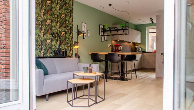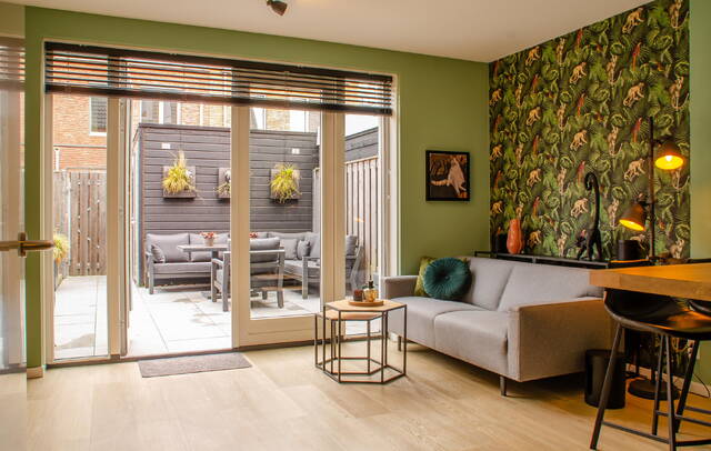 De tuingerichte woonkamer heeft een sfeervolle uitstraling, de wanden zijn voorzien van behang in lichte tinten en design. Over de gehele begane grond ligt een mooie PVC-vloer met vloerverwarming als hoofdverwarming en onder de trap vindt u een goed bemeten kast. De grote openslaande deuren aan de achterzijde verbinden binnen met buiten.