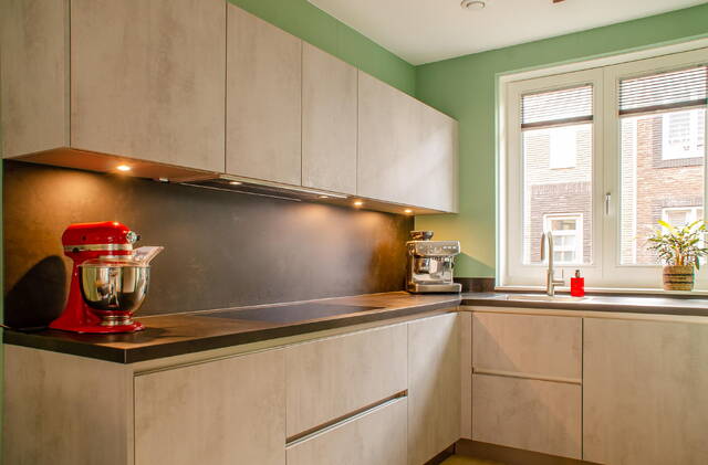 De L-vormige keuken heeft een moderne strakke uitstraling en is voorzien van een composiet werkblad. Daarnaast beschikt de keuken over alle denkbare inbouwapparatuur van Siemens waaronder een combi-oven, stoomoven, inductiekookplaat, vaatwasser en een Quooker (Flex).