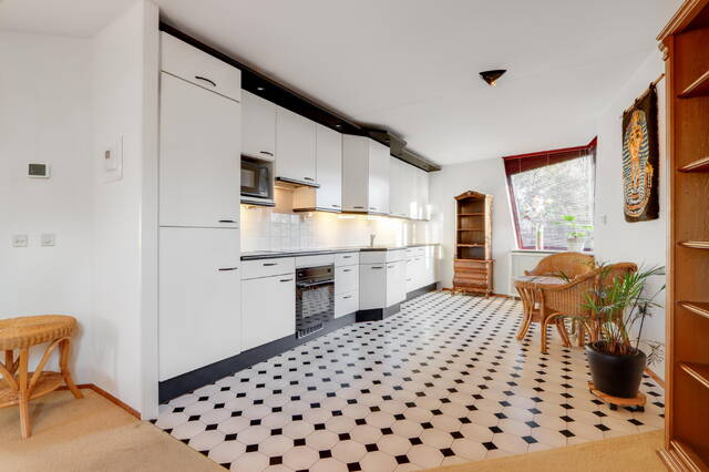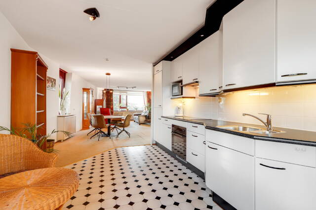 Bij binnenkomst in de hal tref je de garderobe, het toilet, technische ruimte en toegang tot alle vertrekken. Je loopt vanuit de hal door naar de woonkamer. De lichte woonkamer, met toegang tot het balkon, biedt een vrij uitzicht over het omliggende groen, water en Tudorpark. De ruime open keuken sluit mooi aan op de woonruimte en bevindt zich aan de voorzijde van de woning. De keuken is voorzien van een praktische wandopstelling met veel bergruimte. Daarnaast beschikt de keuken over diverse inbouwapparatuur, waaronder een oven, koel-vriescombinatie en afzuigkap.
