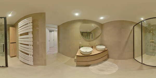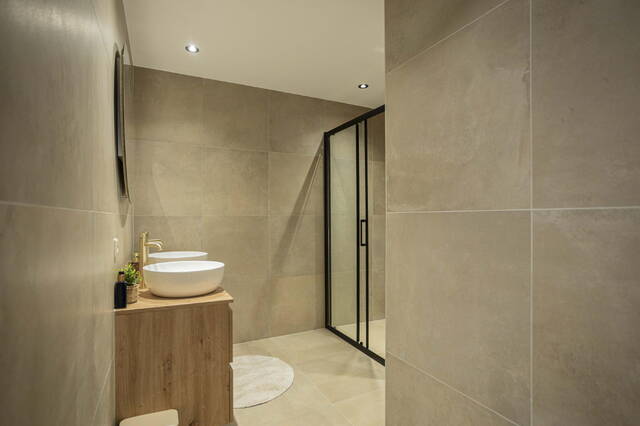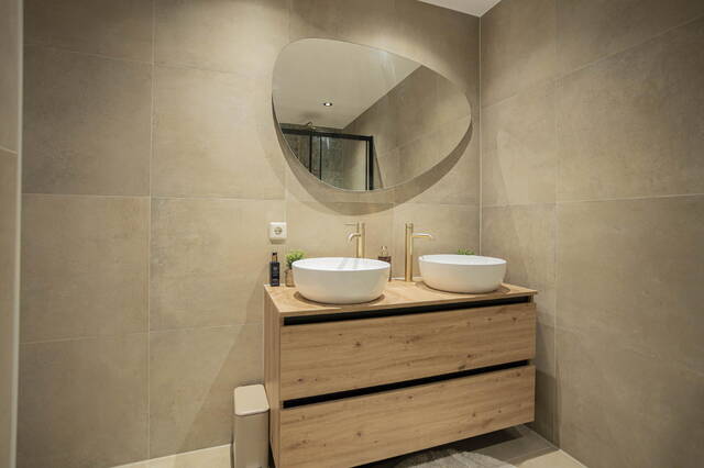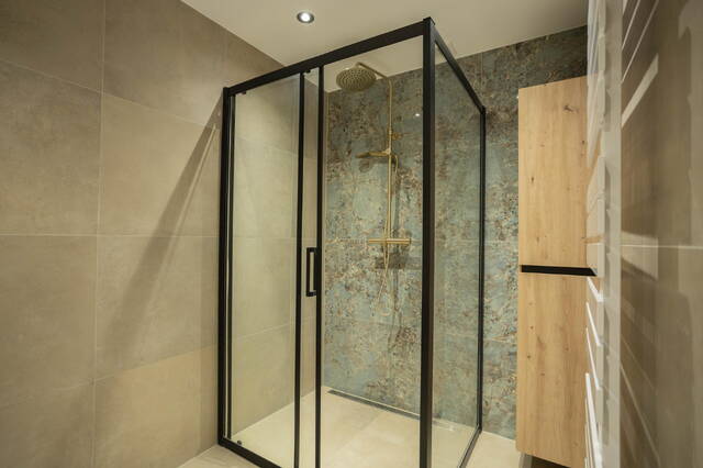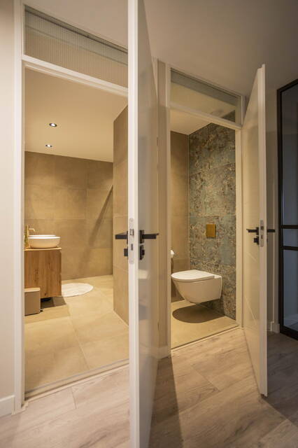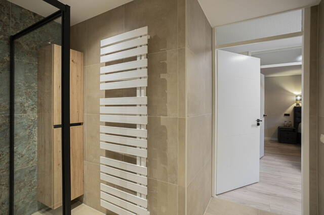 De badkamer, vernieuwd in 2024, heeft een hotel-chique uitstraling gekregen en mooie materialen zijn hier gebruikt. Ook beschikt de badkamer over een handige designradiator en een spiegel met anti-fog systeem. Hier ervaart u pure luxe!