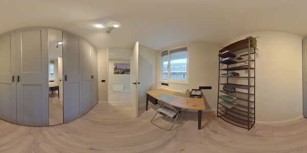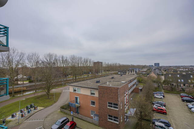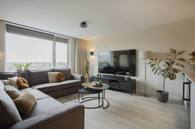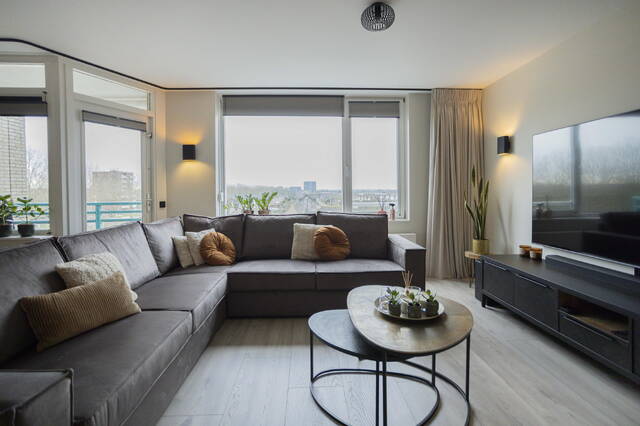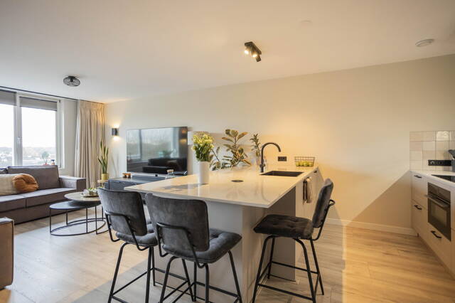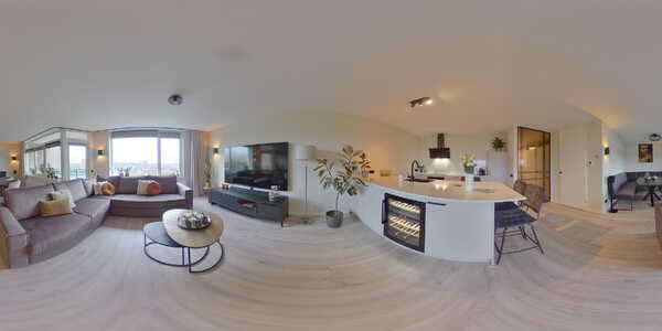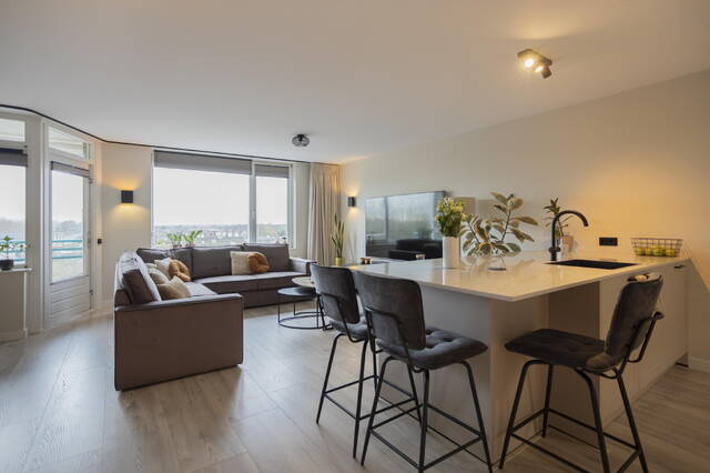 De ruime en lichte woonkamer die gescheiden wordt met de hal door een luxe taatsdeur in de kleur Atomic Brown heeft grote ramen met een fantastisch vrij uitzicht over de wijk, het groen en het water. Hier zult u elke dag van genieten. Door de ligging op de vierde verdieping heeft u veel privacy. Zowel in de woonkamer als in de keuken is alles prachtig afgewerkt en sluiten de elementen mooi op elkaar aan. Fraaie details zijn onder meer de raambekleding die bevestigd zijn aan een strakke zwarte rails langs het plafond, de stijlvolle laminaatvloer en de ingefreesde lampen. Wat een geweldige (leef)ruimte is hier gemaakt door de huidige bewoner.
