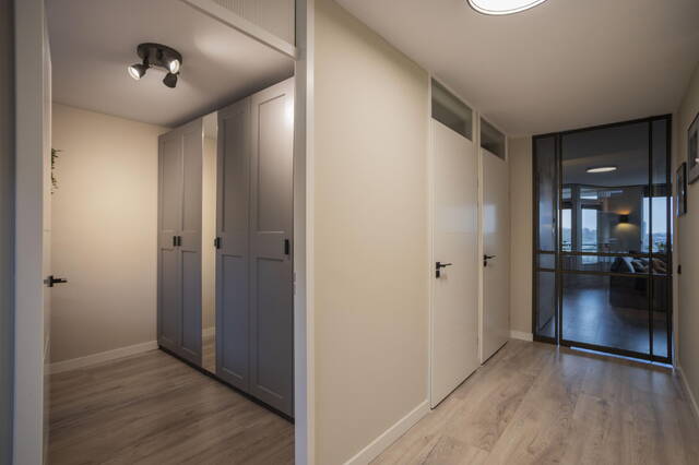 Terwijl u over de galerij loopt, geniet u van het uitzicht naar het prachtige atrium. Bijna aan het einde van de galerij is de voordeur van dit ruime, lichte appartement. De brede hal is een mooie ontvangstruimte van waaruit u de overige ruimtes betreedt. U heeft hier voldoende plek voor uw garderobe, ook vindt u hier de meterkast. Achter één van de deuren is de moderne toiletruimte, ingedeeld met een wandcloset en een fonteintje, geheel vernieuwd in 2024.