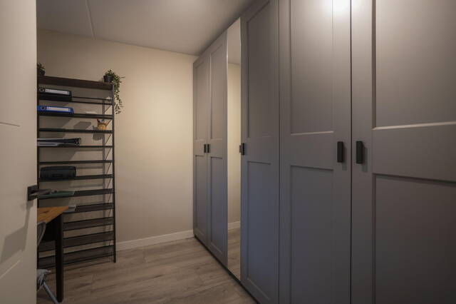 Aan de galerijzijde liggen de twee slaapkamers. De master bedroom heeft een inbouwkast van onder tot bovenaan het plafond. De tweede kamer kan prima dienstdoen als extra slaapkamer, werk/ hobbykamer of als bergruimte. Beide kamers beschikken over een strakke laminaatvloer die door het hele appartement is doorgelegd.
