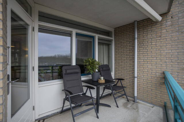 Vanuit de woonkamer is het balkon op het zuidwesten te bereiken. De ligging ten opzichte van de zon is uitstekend en het uitzicht naar het groen en het water is fantastisch. Het balkon biedt veel privacy en genoeg ruimte voor een tafel met stoelen, beplanting in bakken of een klein loungebankje.
