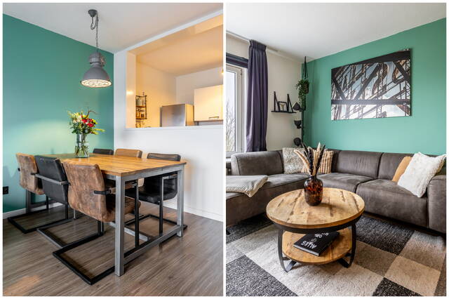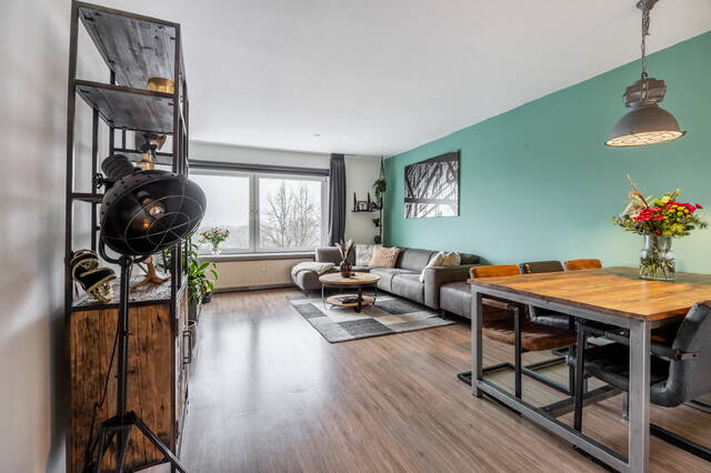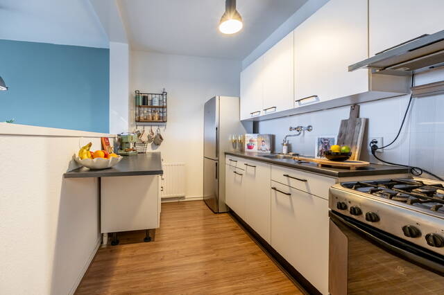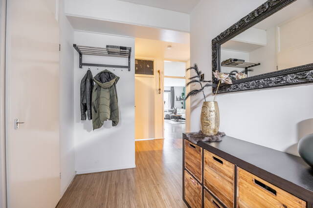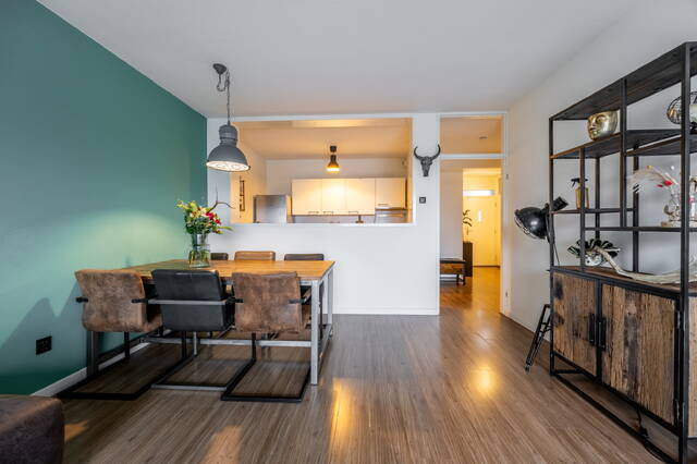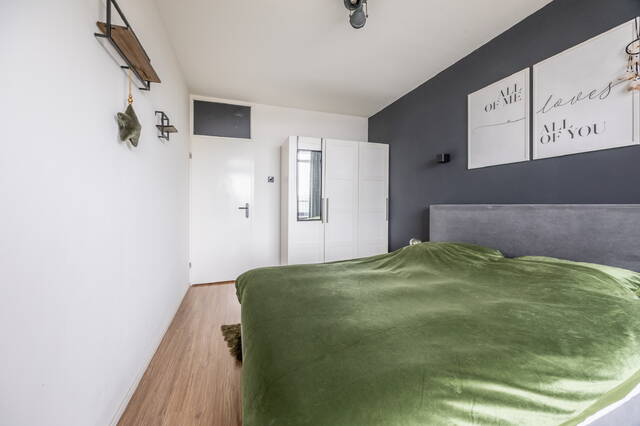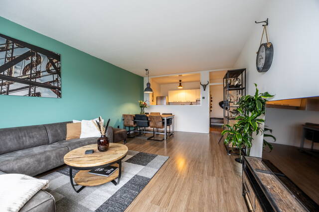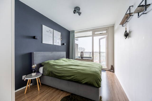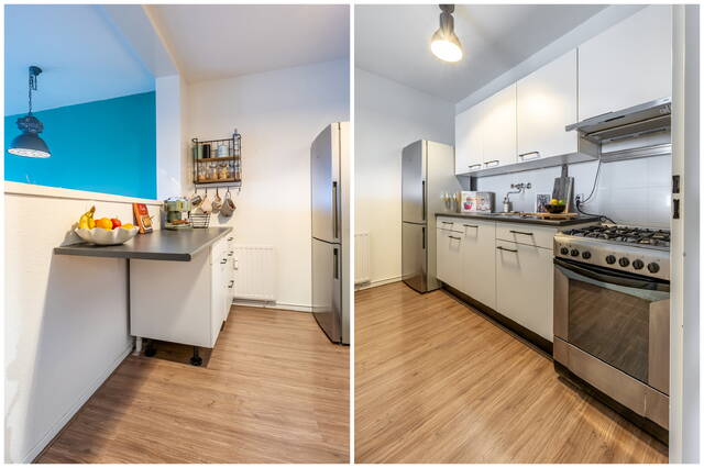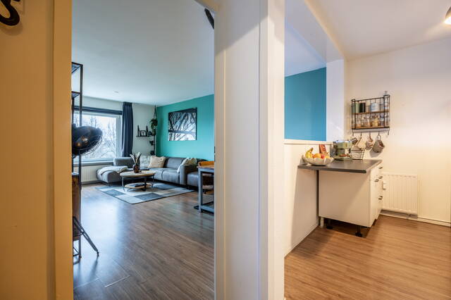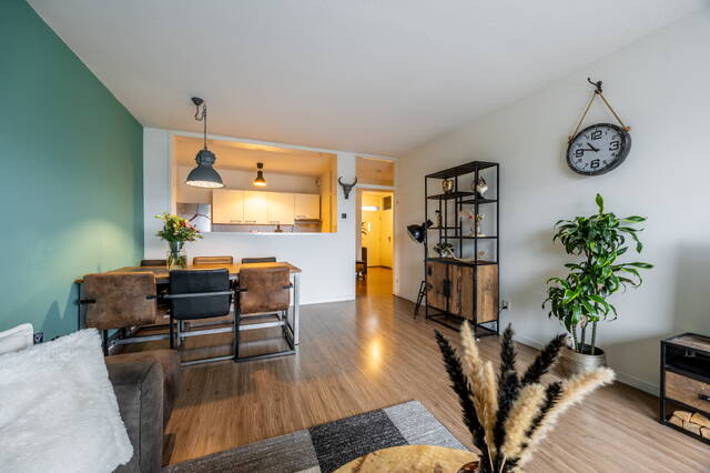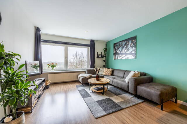 In de gehele woning ligt een laminaatvloer. De woonkamer is licht en ruim opgezet en biedt voldoende ruimte voor zowel een zit- als eethoek. Door de ligging op de vijfde verdieping geniet je hier van veel daglicht en een vrij uitzicht, wat zorgt voor een open en aangename leefruimte.