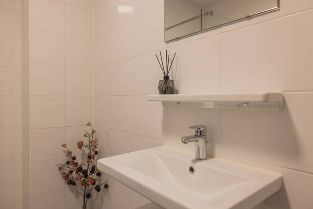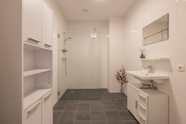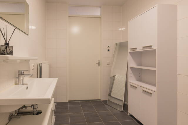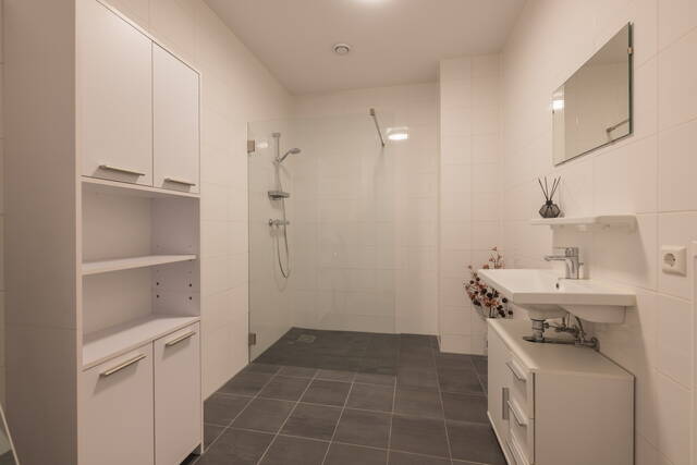 De moderne, volledig betegelde badkamer is voorzien van alle gemakken, waaronder een wastafel, spiegel, apart meubelstuk en grote inloopdouche. Daarnaast is er een separaat toilet met wandcloset en fonteintje. In de aparte technische/bergruimte bevinden zich de Intergas HR cv-combiketel (2016), de wasmachine- en drogeraansluiting, de mechanische ventilatie-unit en de verdeler van de vloerverwarming.