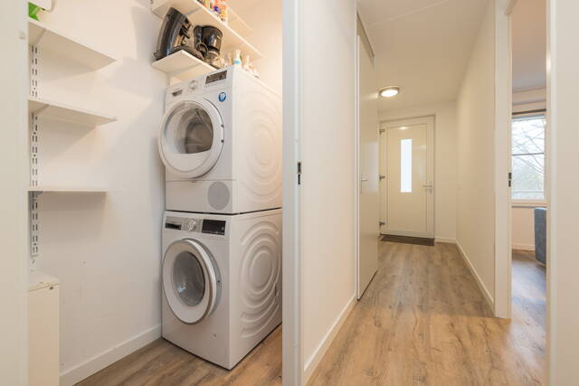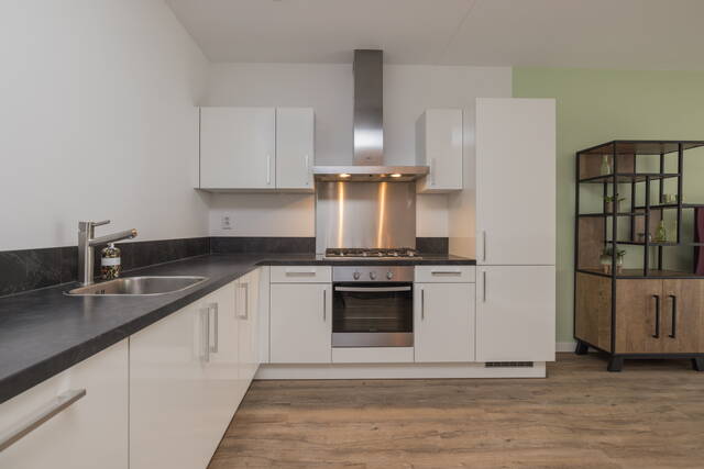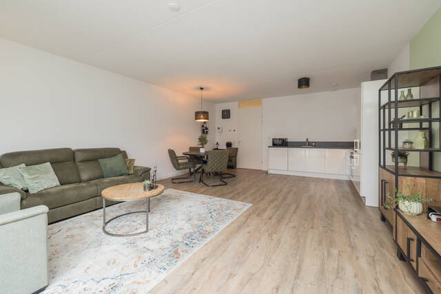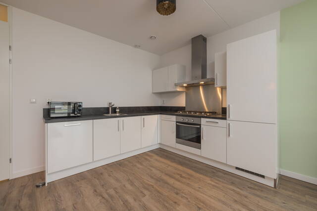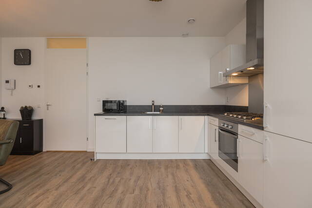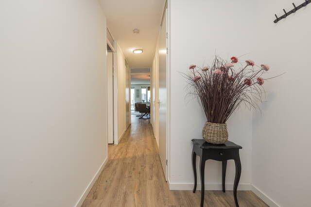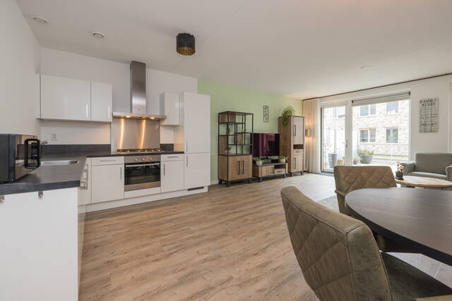 De woonkamer grenst direct aan het dakterras, is licht, ruim en staat in open verbinding met de moderne keuken. De keuken is voorzien van een kunststof werkblad en diverse inbouwapparatuur waaronder een koel-vries combinatie, oven, afzuigkap, vaatwasser en 5-pits gasfornuis. Het gehele appartement is afgewerkt met een fraaie pvc-vloer met vloerverwarming als hoofdverwarming. De wanden zijn voorzien van gladstuc en het appartement maakt een meer dan verzorgde indruk.