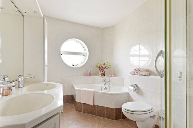 Op de tweede verdieping heeft u vanaf de overloop met bergkast toegang tot drie slaapkamers. Een van deze slaapkamers heeft een oppervlakte van maar liefst 22 m2 en heeft tevens een Frans balkon. De volledig betegelde badkamer is voorzien van een dubbele wastafel prettig tijdens de ochtenddrukte in de badkamer, een zwevend closet, een hoekbad met mengkraan en een separate douche met thermostaatkraan. Er is vloerverwarming en een designradiator.