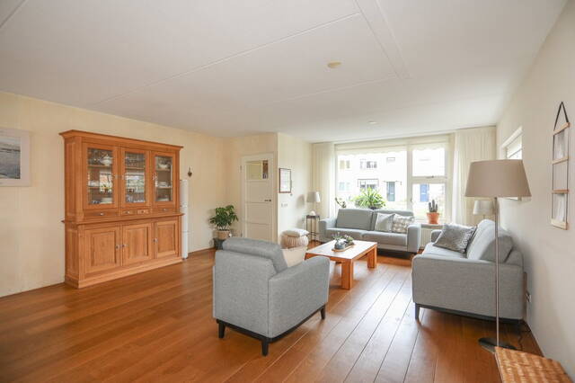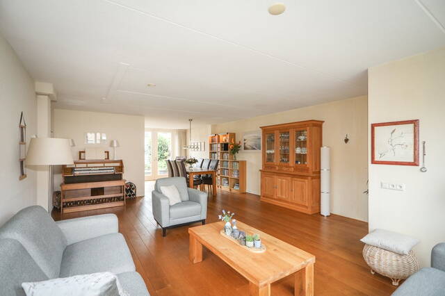 Als je de buitenzijde en het prachtige plekje hebt bewonderd is het tijd om de woning van binnen te bekijken. Via de voordeur kom je in de hal met rechts de garderobe en de meterkast. De vernagelde Frans eikenvloer ligt niet enkel in de hal maar ook in de woonkamer.