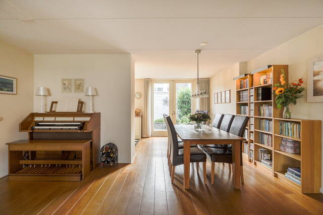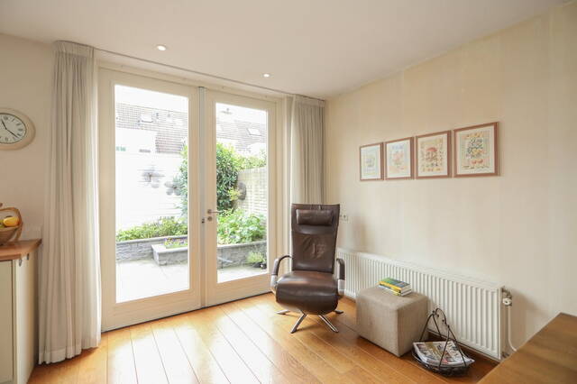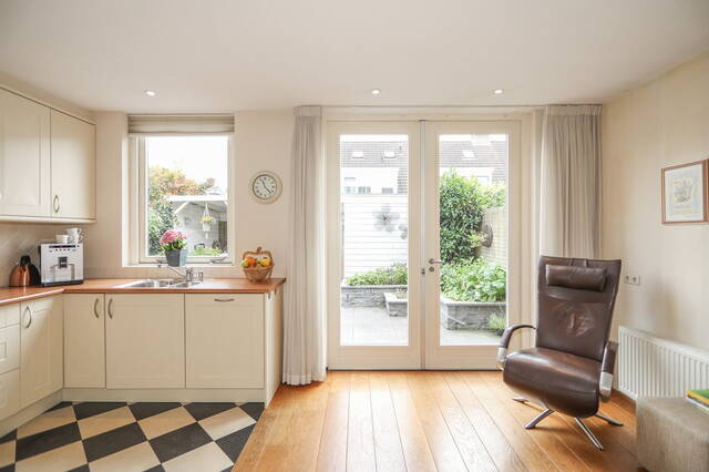De woonkamer is een heerlijke plek; volop de ruimte, heerlijk licht en met fraai uitzicht op het water en het bruggetje aan de voorzijde. Stel je voor dat je hier zit op jouw bank… het is dichterbij dan je denkt. Aan de achterzijde is de uitbouw met de gezellige keuken (met vloerverwarming), inclusief openslaande deuren naar de tuin. De U-vormige opstelling heeft veel bergruimte en alle benodigde apparatuur is ingebouwd: een vijfpits gaskookplaat met afzuigkap, een vaatwasser, koelkast met apart vriesvak en een magnetron en een oven. De inbouwverlichting en de diagonaal gelegde tegelvloer zijn de sfeermakers.