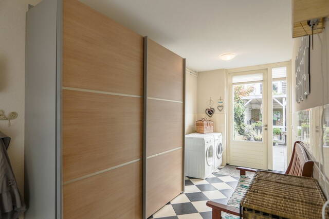 Links van de woning is de grote bijkeuken met vloerverwarming, te bereiken vanuit de woonkamer en de achtertuin. Hier zijn de trap naar de eerste verdieping, de toiletruimte met fonteintje en heb je de beschikking over veel praktische bergruimte. In de hoek van de bijkeuken zijn de aansluitpunten voor de wasmachine en droger.