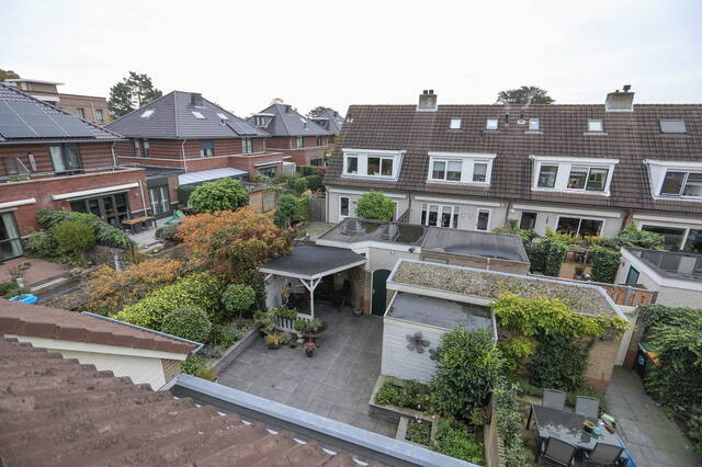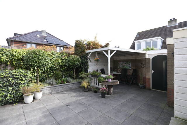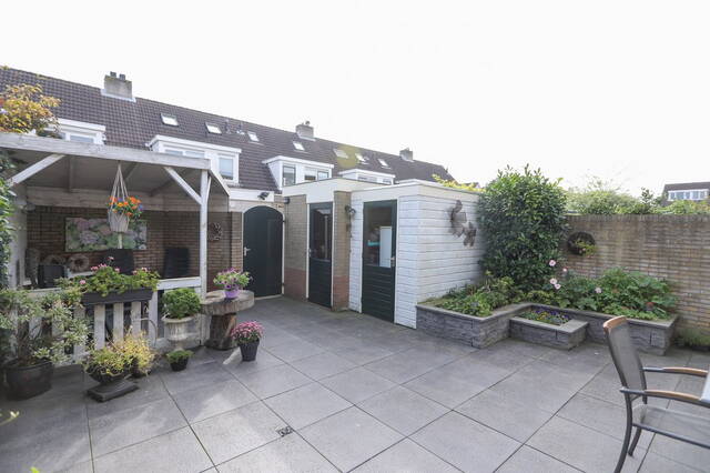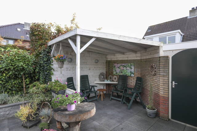 De voortuin is strak aangelegd met verhoogde borders, afgewerkt met natuursteen. Diverse planten, bloemen en enkele lage bomen zorgen hier voor een vriendelijke uitstraling. De onderhoudsvriendelijke, brede achtertuin ligt op het zuidoosten en biedt dankzij de lage omliggende bebouwing volop zon. Rechts in de tuin zijn twee bergingen, voorzien van elektra, waarvan een stenen berging en een 2e aangebouwde berging van hout. Blikvanger is echter de sfeervolle houten veranda waar de bewoners vele uren vertoeven en genieten van het mooie plekje waar zij wonen. Tussen de veranda en de berging is de houten poort naar de gezamenlijke achterom.