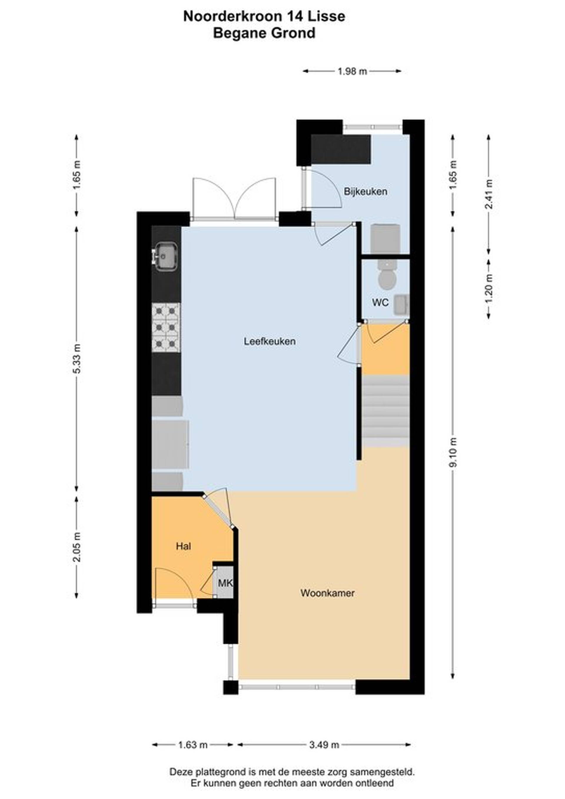 In de hal zijn de meterkast en de garderobe. De woonkamer met erker is gesitueerd aan de voorzijde en aan de tuinzijde van de woning is de ruime eigentijdse keuken. Doordat de eettafel centraal in het midden staat heeft u direct contact met uw familieleden of gasten. De keuken (2012) heeft alle benodigde inbouwapparatuur: een 6-pits gasfornuis een grote oven, afzuigkap, vaatwasser en een enorme koel/vriescombinatie. De gehele benedenverdieping is voorzien van een laminaat vloer. De woning geeft zo ontzettend veel ruimte weer. De bijkeuken is voorzien van een keukenblok en de wasmachine en droger aansluiting. Via de keuken komt u in de gang met het toilet en de trapopgang naar de eerste verdieping.