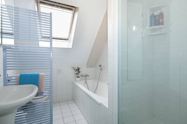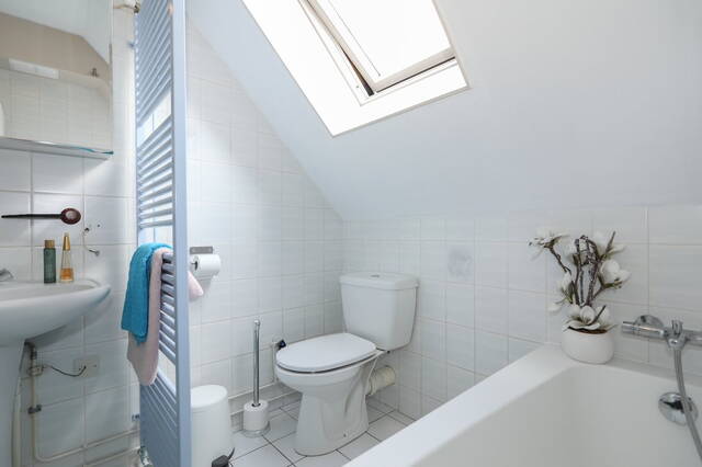 Hier bevinden zich 3 slaapkamers, de badkamer en een overloop. De lichte betegelde badkamer is ingedeeld met een toilet, douche, ligbad en een wastafelmeubel. Kortom : Genoeg ruimte voor een gezin!