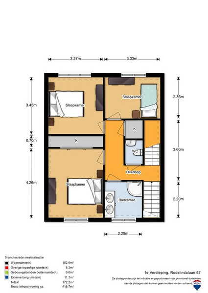 Overloop met toegang tot alle vertrekken op de 1e verdieping. De ruime badkamer is voorzien van een douchecabine, en een dubbele wastafel welke opgewassen is tegen de grootste verkeersdrukte in de ochtend. De ruime master bedroom is aan de voorzijde gesitueerd en voorzien van een ruime grote inbouw schuifkast. De twee andere slaapkamers bevinden zich aan de achterzijde. Op deze verdieping treft u tevens een aparte berging en een separaat toilet. De twee ruimste slaapkamers en de badkamer hebben luxe gemotoriseerde rolluiken die werken als extra zonwering, en als geluid en licht isolatie. U bent verzekerd van een goede nachtrust!