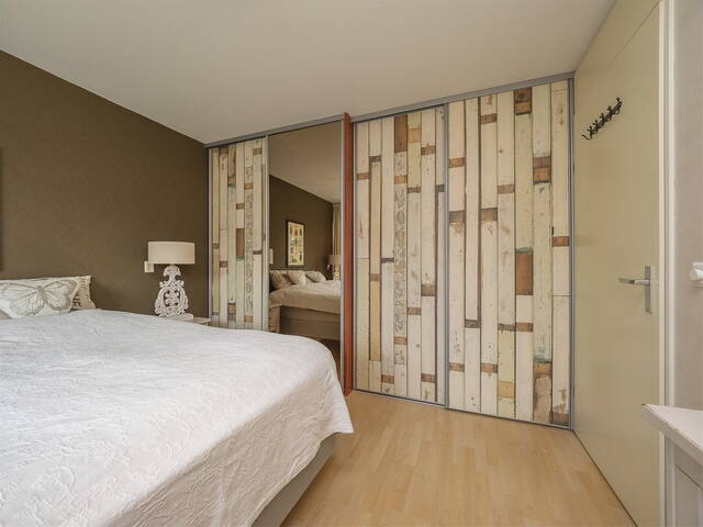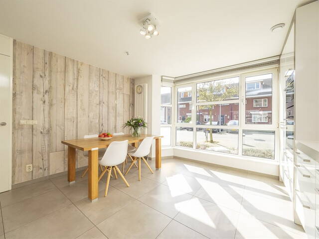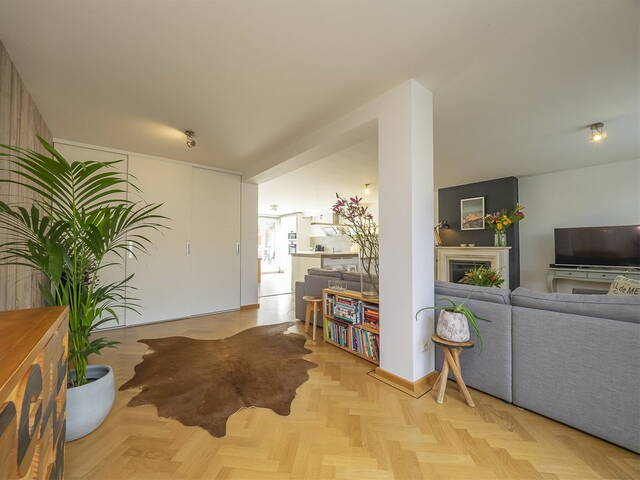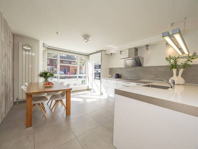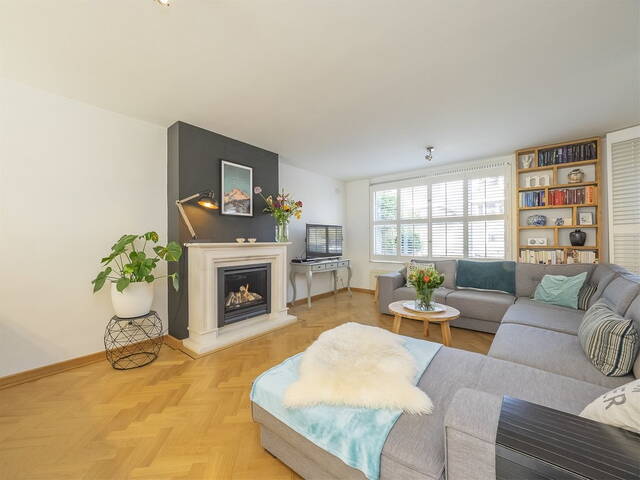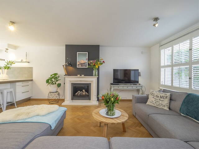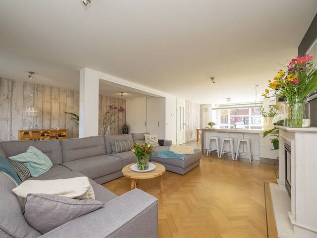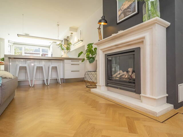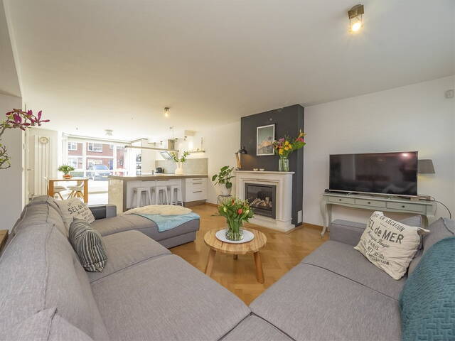 De woonkamer heeft een visgraten houten vloer en een sfeervolle gesloten gashaard met natuurstenen schouw. Zowel de wanden als het plafond zijn strak gestucd. Tevens is er een praktische schuifwand met berging gerealiseerd. De moderne lichte woonkeuken is voorzien van diverse inbouwapparatuur met o.a.: inductie kookplaat, afzuigkap, vaatwasser, koelkast, aparte vriezer, oven, magnetron en een boiler.