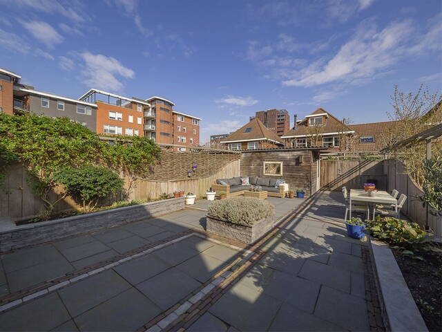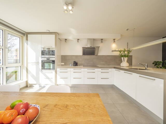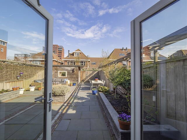 Vanuit de hal toegang tot de open keuken en de uitgebouwde lichte woonkamer (samen ca 65m2). De woning heeft openslaande deuren naar de zonnige diepe ruim 7 meter brede tuin waar je de gehele dag geniet van de zon.