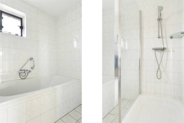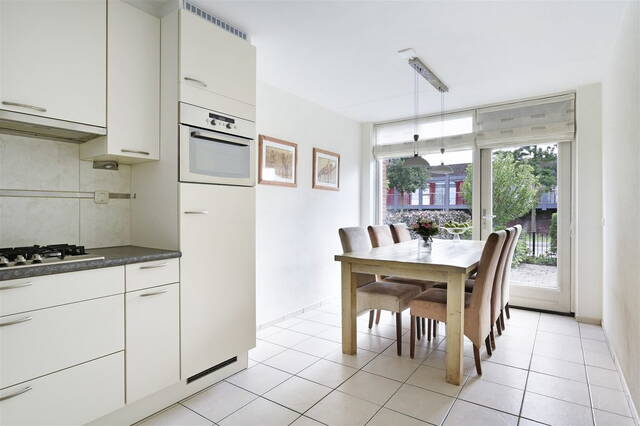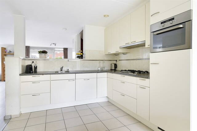 Entree, hal, meterkast en eigentijds toilet met wandcloset en fonteintje en een grote bijkeuken. De ruime woonkeuken met plavuizen en vloerverwarming is uitgevoerd met diverse inbouwapparatuur, waaronder; 5-pits fornuis, afzuigkap, koelkast, vaatwasser en combi-oven. De ruimte is optimaal benut en oogt ruimtelijk tegelijk. De woonkamer (40m2) is uitzonderlijk ruim met een recent gelegde laminaatvloer is voorzien van een trapkast en heeft openslaande deuren met toegang tot de diepe achtertuin. Dit is een ruimte waar je direct verliefd op wordt…. Ruim en licht.