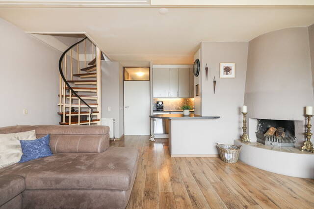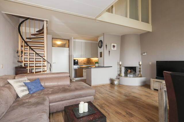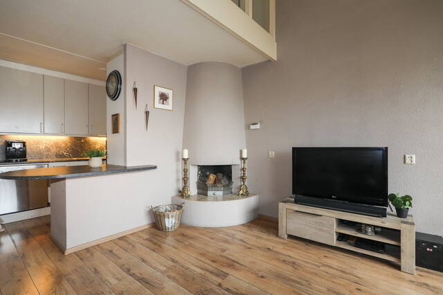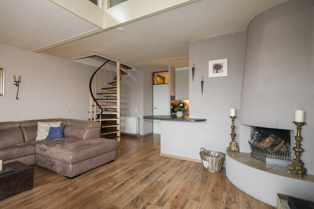 De woonkamer heeft een open haard waar u heerlijk kunt zitten. De woonkamer is gesitueerd aan een balkon met een vrij uitzicht. Dit balkon is gericht op het noordwesten dit betekent dat u tot ‘s avonds laat van de zonsondergang kunt genieten. In de woonkamer heeft u de trap op gang naar de eerste verdieping.