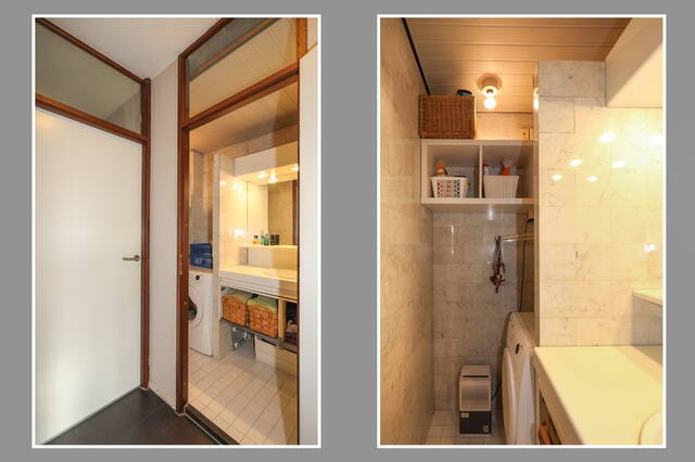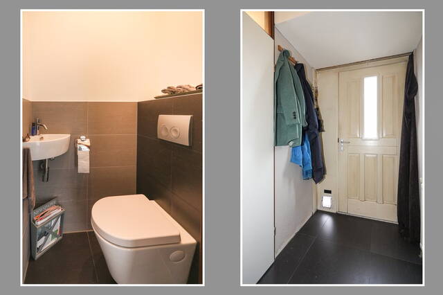 Bij binnenkomst stapt u in de hal waar u de toiletruimte, een kastruimte met daarin de opstelling van de cv-ketel (Atag, bouwjaar 2012 Lease) en de aansluitingen voor de wasmachine en droger treft. Het toilet is geheel betegeld in moderne kleurstelling en heeft een wandcloset en een fonteintje.