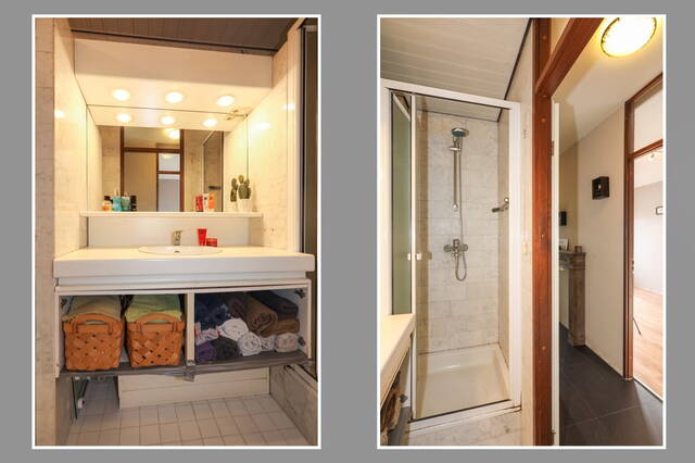 Verder bevind zich ook op de begane grond de badkamer. De badkamer is voorzien van douche, wastafelmeubel met opbergruimte en spiegel. De wasmachine bevind zich in de badkamer. In de badkamer is tevens een aansluiting voor de wasmachine en droger.