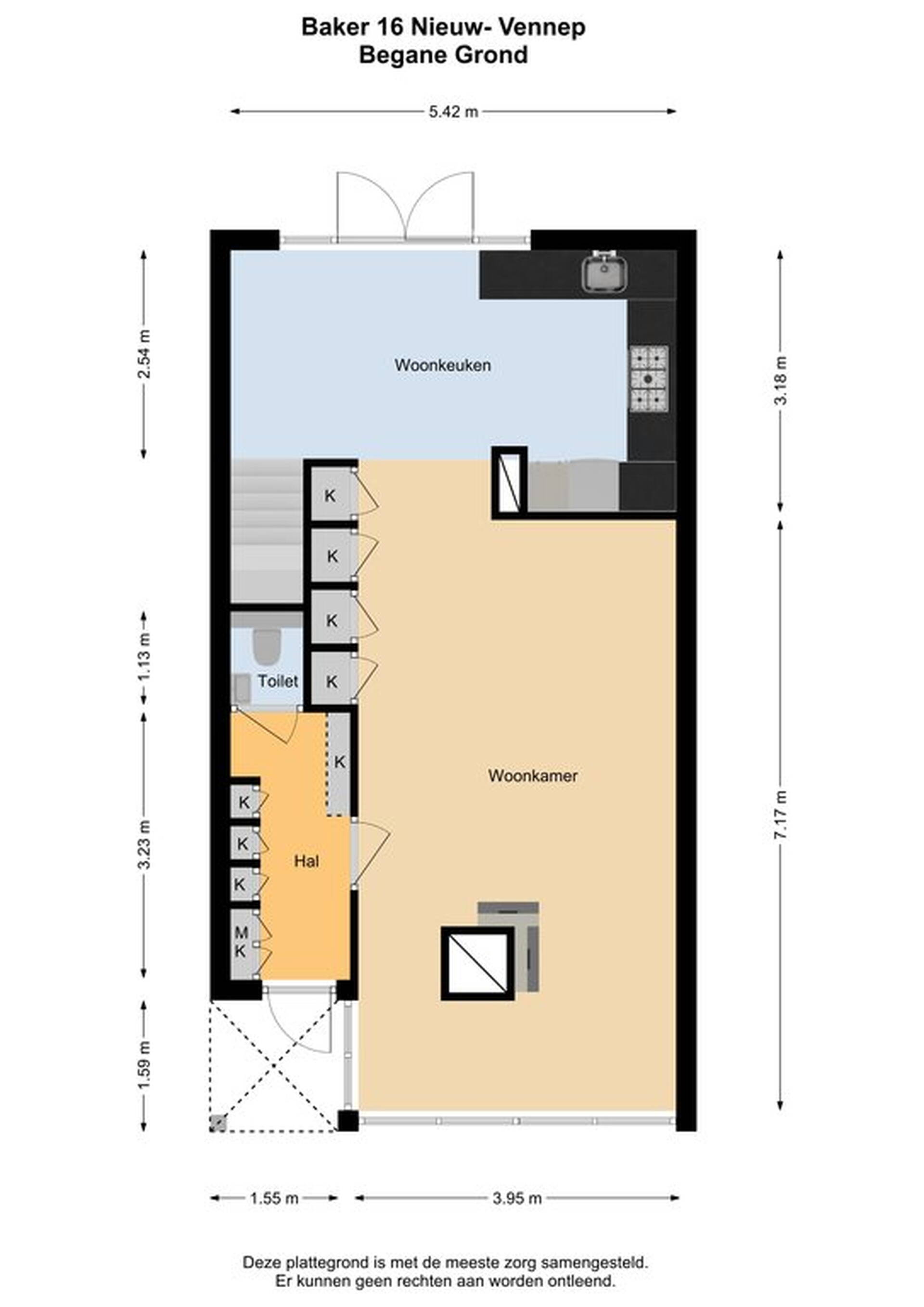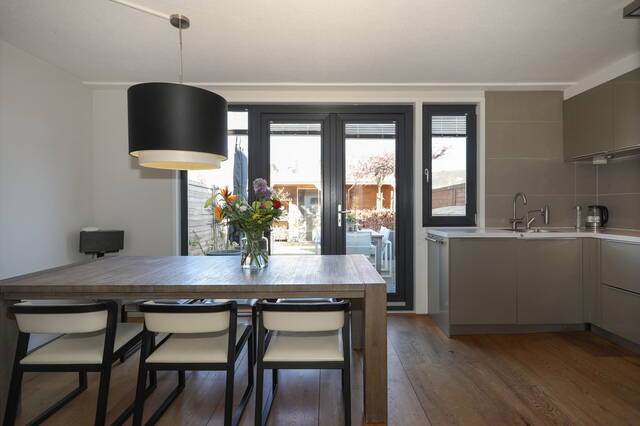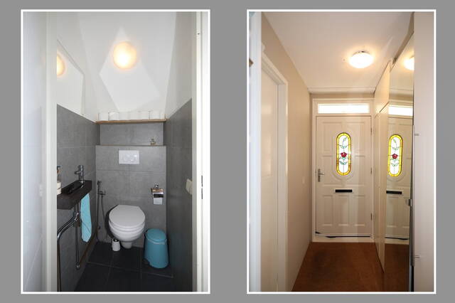 Links in de hal is de meterkast en een opbergkast, aan de rechterkant tref je een grote kast aan waar je met gemak al je schoenen in kwijt kunt en achterin de gang bevindt zich het moderne wandcloset met hardstenen fonteintje. De woonkamer is vergroot aan de voorzijde doordat de voormalige serre bij de woning is betrokken. Zowel in de woonkamer als in de eigentijdse keuken is de vloer voorzien van eikenhouten kasteelplanken. In de woonkamer zijn, naast de televisie, een viertal inbouwkasten op maat gemaakt, zeer praktisch om al je spullen in op te bergen. De keuken (2010) betreft een U- opstelling in een moderne champagne parelmoer uitvoering met composiet blad en voorzien van alle benodigde inbouwapparatuur van Siemens: een 5-pits gasfornuis, een vaatwasser, afzuigkap, koelkast vriezer, combi-oven en koffiemachine.