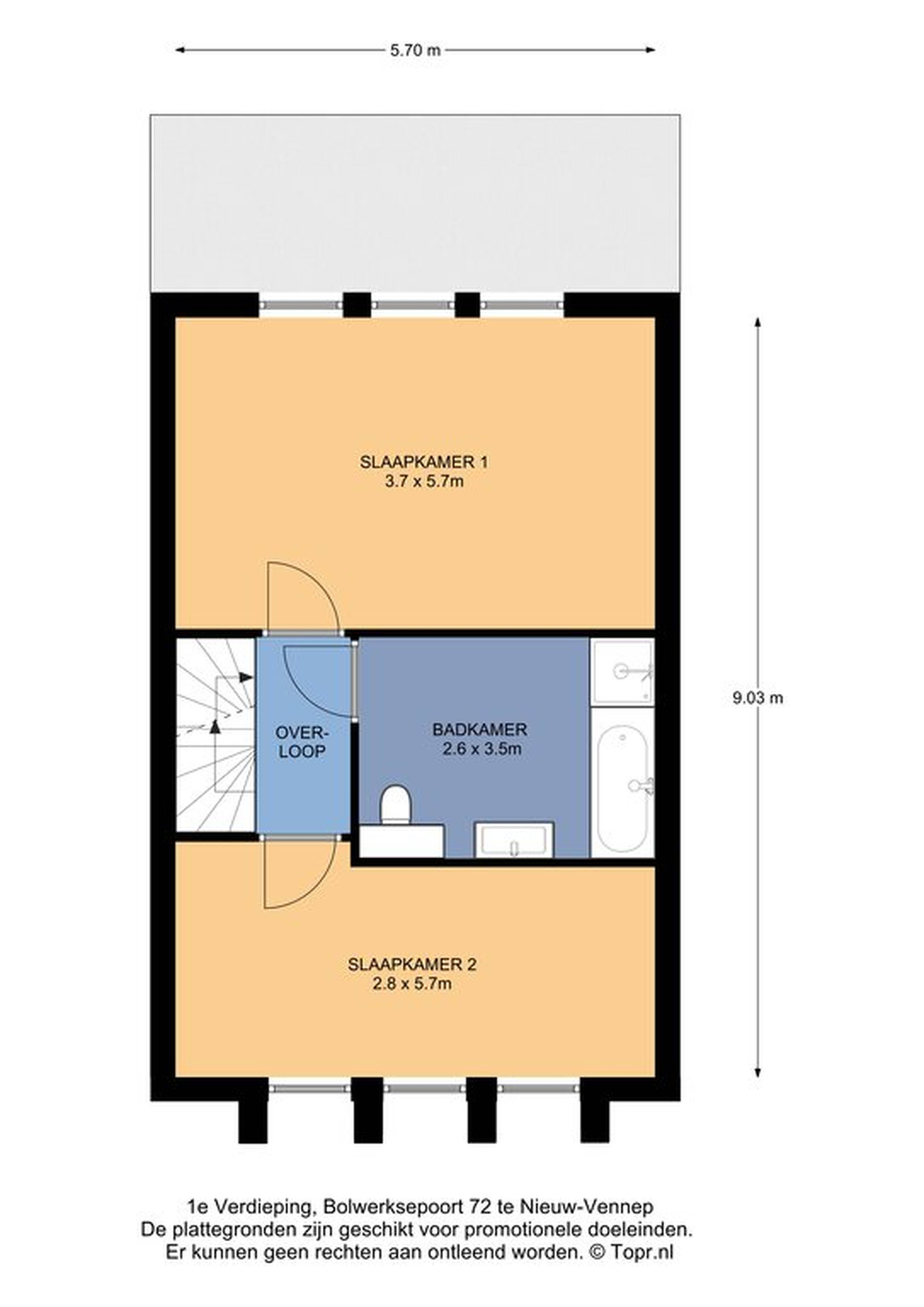 Op de eerste verdieping zijn twee zeer ruime slaapkamers en de badkamer. Beide slaapkamers zijn maar liefst 5,70 meter breed en hebben elk drie grote ramen. De kamer aan de voorzijde heeft verduisterende plisségordijnen (2019), drie screens (zonwering) en een laminaatvloer. Aan de achterzijde is de ouderslaapkamer met tapijt op de vloer en een ruime opstelling van het bed en de garderobekast. Alle ramen in de gehele woning die open kunnen zijn voorzien van insectenhorren (2019).