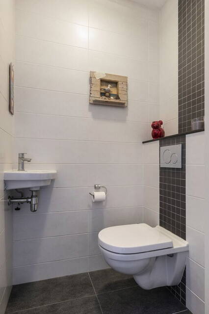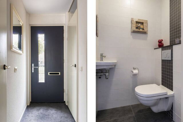 Kom binnen in de hal van deze ruime, lichte woning en laat je verleiden door de mooie uitstraling. Links in de hal zijn de toiletruimte met fonteintje en de trap naar de eerste verdieping. De mooie woonkamerdeur met glas en de plavuizen zorgen voor de juiste sfeer. In de hal is voldoende plek voor een kapstok; aan ruimte geen gebrek.