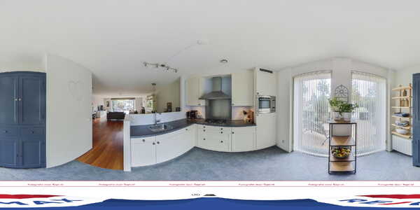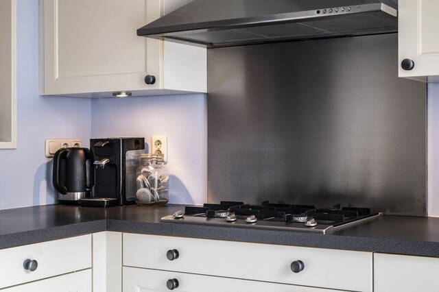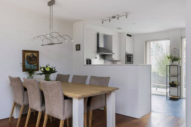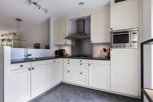 Aan de voorzijde is de halfopen Siematic keuken met twee hoge ramen, een plavuizen vloer met vloerverwarming en een halfhoge muur die de scheiding vormt met de woonkamer. De hoekopstelling is voorzien van diverse onder- en bovenkasten in een neutrale kleur, een donker werkblad en alle benodigde apparatuur is ingebouwd: een 4-pits gaskookplaat, afzuigkap, combimagnetron, koelkast, vriezer en een vaatwasser. Aan de andere kant van de keuken is ruimte voor een servieskast.