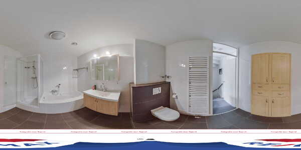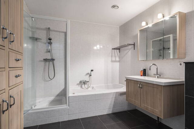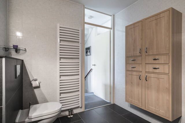 Tussen de slaapkamers is de badkamer, te bereiken vanaf de overloop. De wanden zijn geheel betegeld in een lichte kleur en de ruimte is ingedeeld met een ligbad, aparte douche, een handdoekenradiator, tweede toilet en een wastafel. Aan bergruimte geen gebrek; de wastafel heeft een spiegelkast en een kast onder de wastafel. De plavuizen op de vloer en bij het toilet vormen een smaakvolle combinatie met de kleur van de wandtegels en het wastafelmeubel.