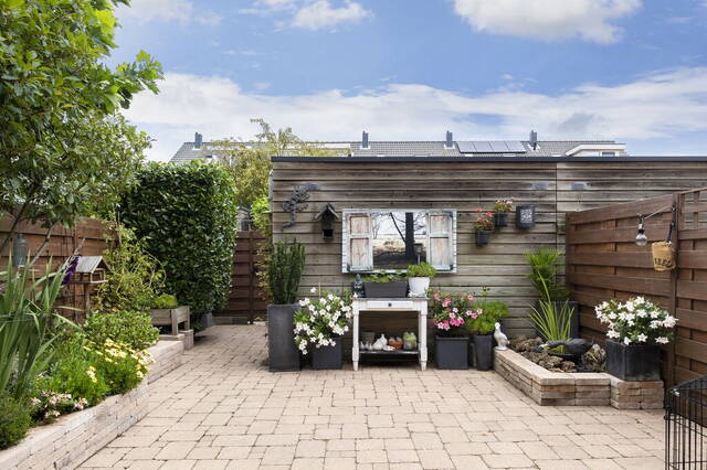 De gezellige achtertuin ligt op het noordoosten en biedt zowel zon als schaduw. Achterin de tuin staat een houten zeer ruime berging voor de fietsen en opslag en er is een poort naar de gezamenlijke achterom. Houten schuttingen zorgen voor privacy en in de verhoogde borders staat diverse beplanting. Verder is de tuin geheel betegeld waardoor je alle ruimte hebt om buiten te zitten.