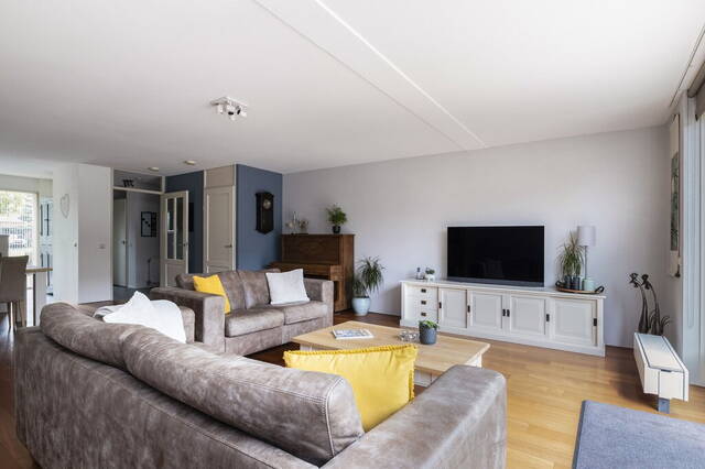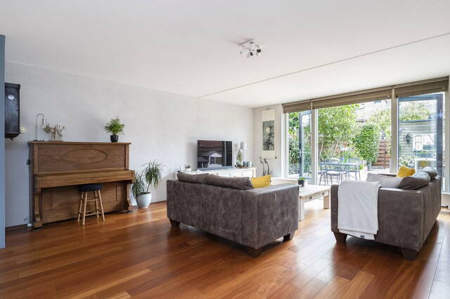 De tuingerichte woonkamer heeft een grote uitbouw aan de achterzijde en een mooie parketvloer welke past bij diverse interieurstijlen. Onder de trap is een bergkast met een paneeldeur en de woonkamer heeft een mooie verdeling tussen het zit- en het eetgedeelte. De achtergevel bestaat voor een groot deel uit glas en heeft openslaande tuindeuren waardoor binnen en buiten een mooi geheel vormen.