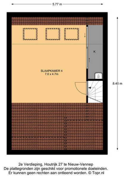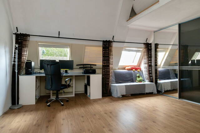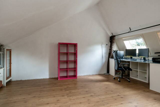 De enorme ruimte op de tweede verdieping biedt veel mogelijkheden. Drie aluminium dakramen aan de achterzijde zorgen voor veel lichtinval en er is veel bergruimte in de schuifdeurkast en de bergvliering. Op de vloer ligt laminaat en je kunt naar eigen wens extra (slaap)kamers realiseren, gecombineerd met nieuwe dakramen of een dakkapel.