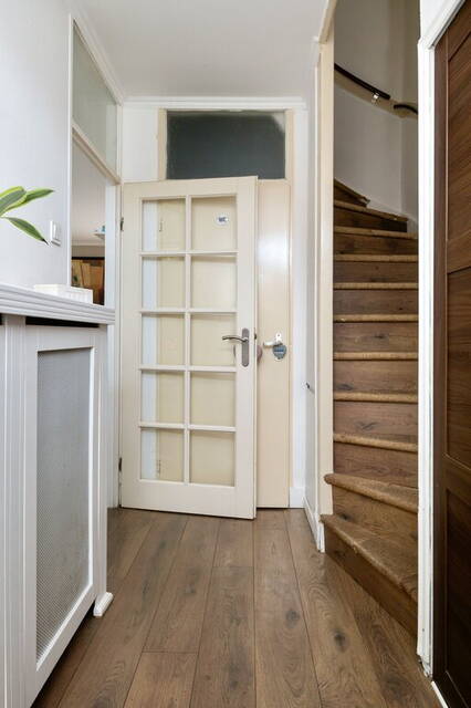 Via de carport en de voortuin loop je naar de hal van deze gezellige woning. Rechts in de hal zijn de trap naar de eerste verdieping en een brede kast met de meterkast en garderobe. Naast de trap is de toiletruimte met een staand toilet en een fonteintje. In de hal, toiletruimte en woonkamer ligt laminaat op de vloer, de trap is bekleed met tapijt en de radiatoren zijn voorzien van een ombouw.