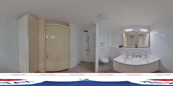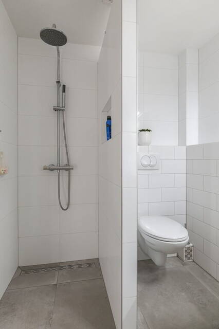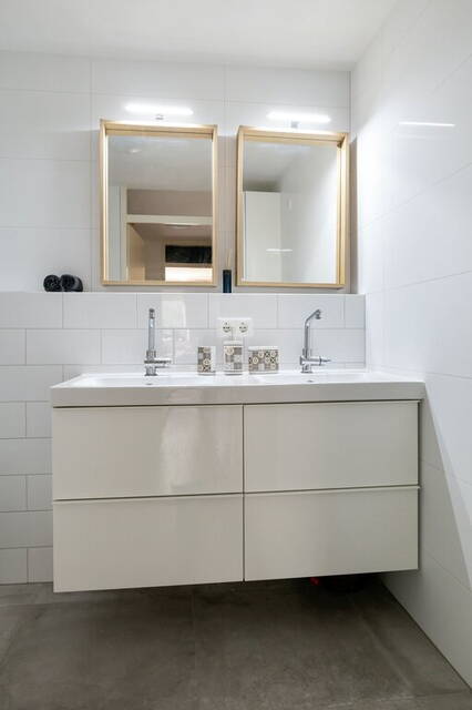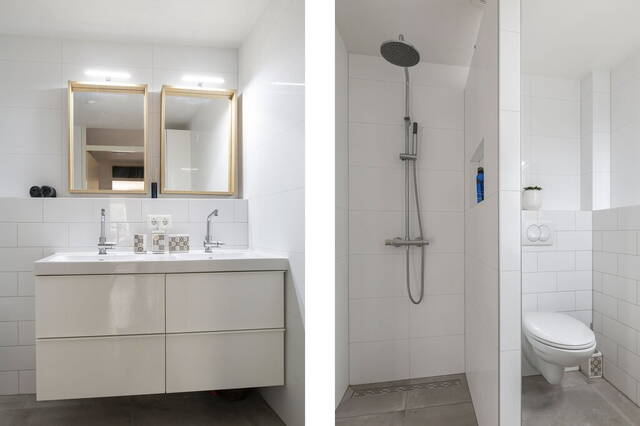 De moderne badkamer met vloerverwarming heeft een inloopdouche met stortdouche, een tweede toilet en een wastafelmeubel met twee wastafels. De wanden en de vloer zijn geheel betegeld in een lichte, mooie kleurencombinatie.
