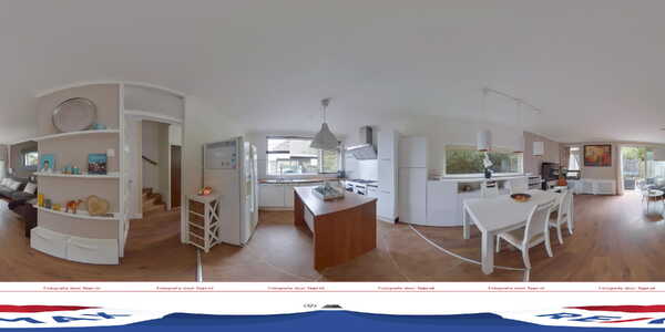 Aan de voorzijde is de open keuken met een groot raam aan de westzijde en een diagonaal gelegde plavuizen vloer. De keukenopstelling heeft veel bergruimte, twee werkbladen en alle benodigde apparatuur is aanwezig: een grote Amerikaanse koelkast van LG, een 5-pits gasfornuis met grote oven, afzuigkap, vaatwasser en een magnetron. Met een druk op de knop heb je ijsklontjes in je favoriete drankje en in de hoge apothekerskast heb je een zee aan ruimte.