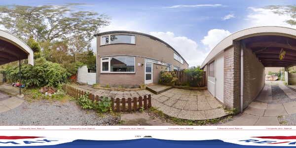 De woning staat op een groot perceel en heeft een voor-, zij- en achtertuin. De voortuin is verhard met bestrating en grind, net als de ondergrond van de carport. Links van de woning is een witte poort naar de zij- en achtertuin.