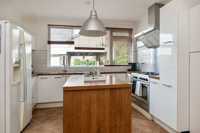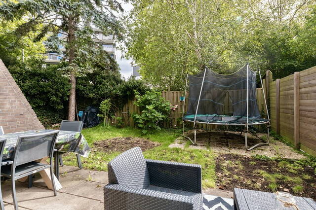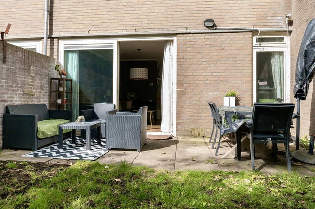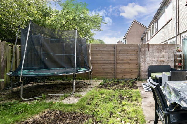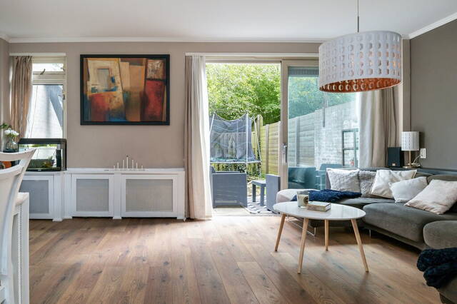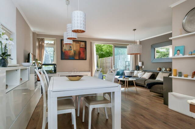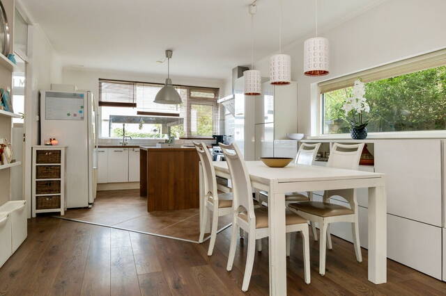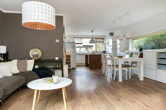 De woning heeft een meer dan 5.75 meter brede, tuingerichte woonkamer met een schuifpui naar de tuin en ramen bij het zit- en het eetgedeelte. Er is ruimte voor een grote zithoek, een lange eettafel en meerdere kasten. Aan twee kanten kijk je naar het groen en geniet je van de vogels die regelmatig een bezoek brengen aan deze tuin.
