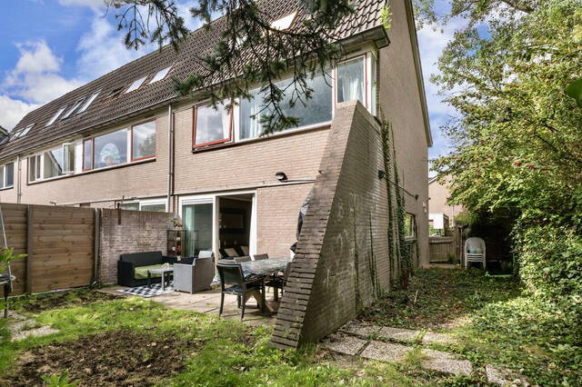 De achtertuin ligt op het oosten en biedt door de hoge bomen en beplanting veel privacy. De tuin is ingedeeld met twee terrassen en een grasveld.