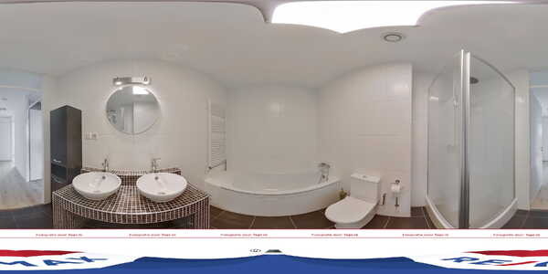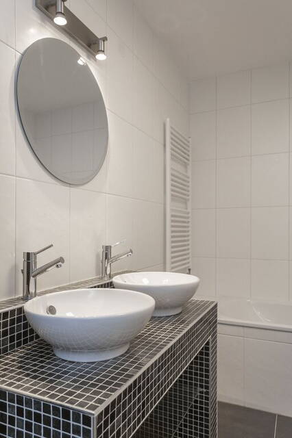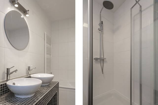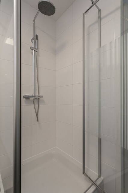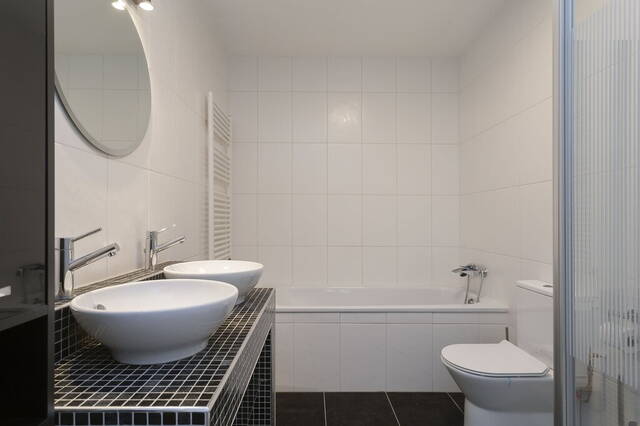 Overloop met toegang tot alle kamers op deze verdieping. Aan de voorzijde is de een ruime slaapkamer met een ingebouwde kastenwand en de badkamer. De badkamer heeft een douchecabine, ligbad, dubbele wastafel, een toilet en een design radiator.