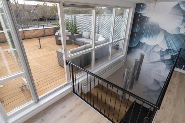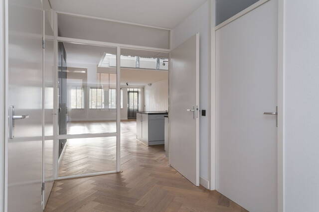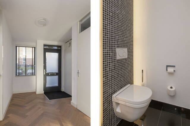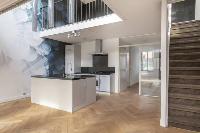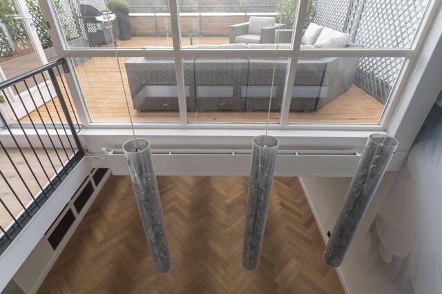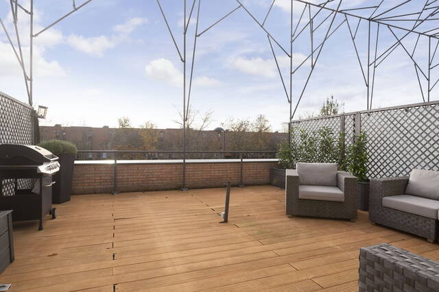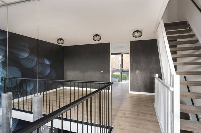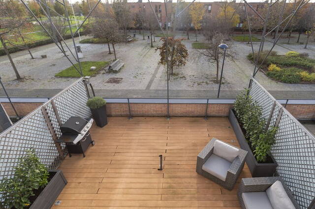 Ruime overloop met de vide, deze ruimte is ook uitstekend te benutten als kantoor- of loungeruimte. Aan de voorzijde heeft u een ruime slaapkamer over de gehele breedte van de woning. Het riante dakterras van maar liefst ca. 41m2 is gelegen op het zuidwesten. Door de gunstige ligging heeft u de gehele dag zon op het terras. Het terras is onderhoudsvriendelijk aangelegd en biedt uitzicht over het Herfstpark. De trap is voorzien van een taupe vloerbekleding.