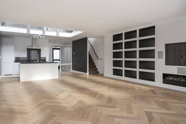 Entree in een ruime hal met meterkast, ruime trapkast en toiletruimte met wandcloset met wandverlichting. Vanuit de hal heb je toegang tot de ruime inpandige berging welke ook een eigen toegangsdeur met dubbele beglazing heeft vanuit de voortuin. Deze ruimte kunt u ook gebruiken voor een kantoor of praktijkruimte. De woning heeft een royale en lichte woonkamer met open keuken met veel natuurlijke lichtinval middels de vide. De woonkamer is voorzien van een fraaie visgraat houten vloer met vloerverwarming, een elektrische open haard, handmatige rolluiken en een deur naar de parkzijde. De keuken is uitgevoerd in een lichte kleurstelling en inbouwapparatuur waaronder een 4-pits fornuis, afzuigkap, oven, koelkast, vriezer en een spoeleiland met zeep- en handcrème pompje. De trap is naar de eerste verdieping is voorzien van een taupe vloerbekleding.