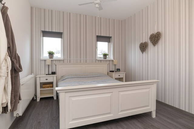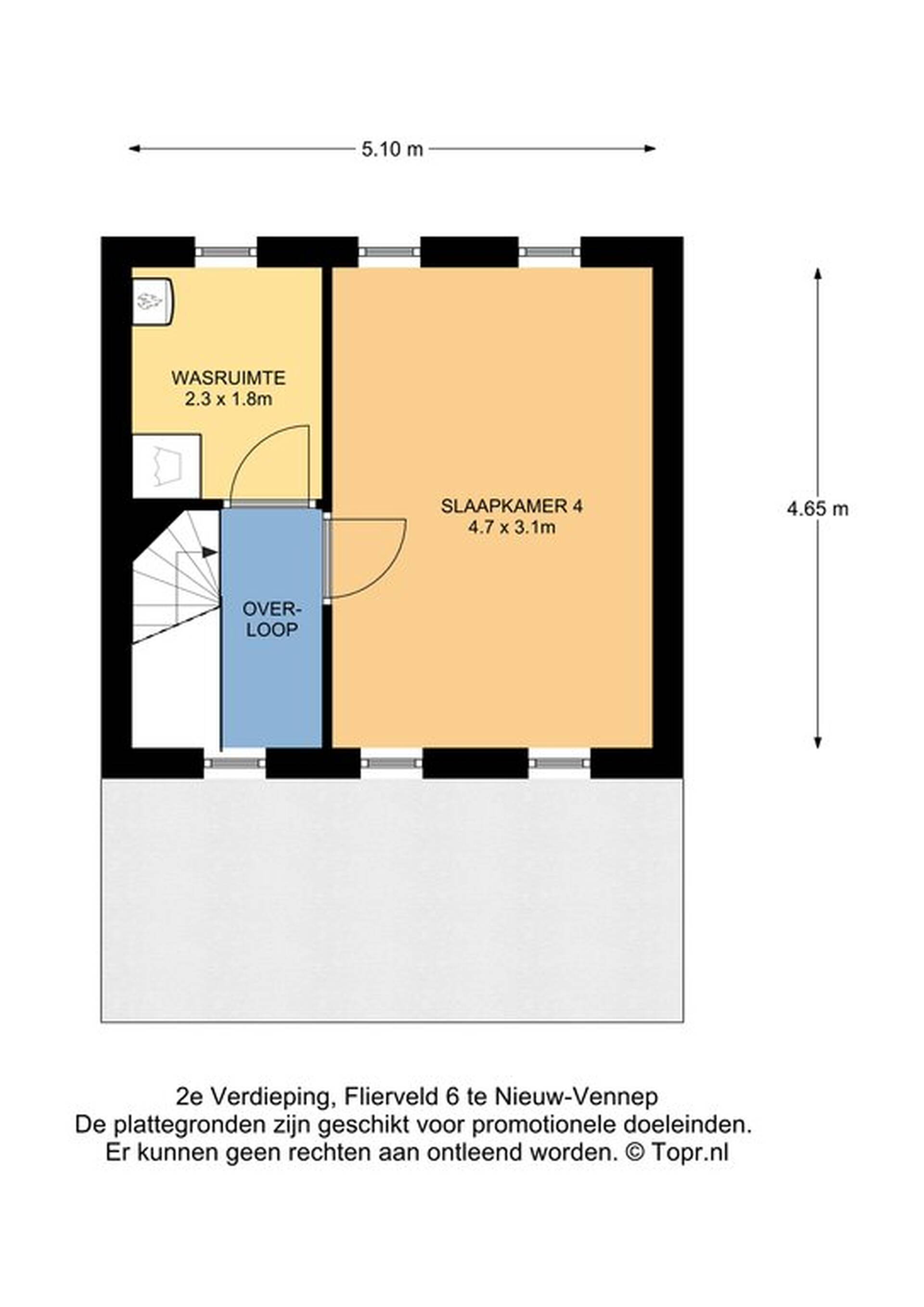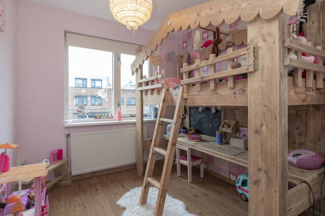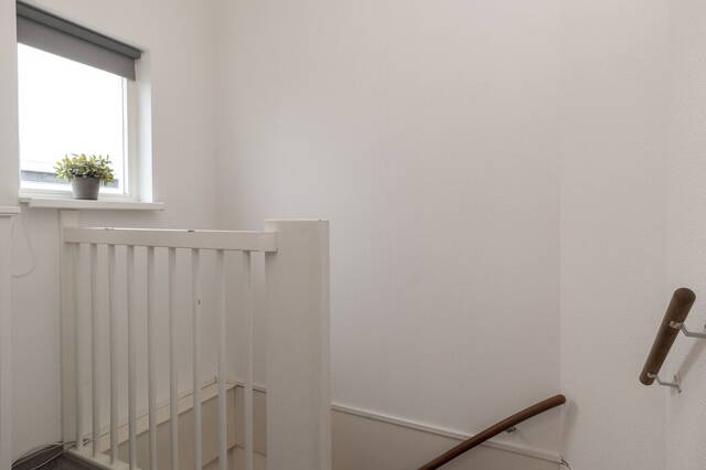 Aan de buitenzijde heb je het al gezien; deze woning heeft een dakopbouw waardoor er niet twee maar drie verdiepingen zijn. De ruimte is ingedeeld met een overloop, wasruimte en een vierde slaapkamer. In alle ruimtes ligt een donkergrijze laminaatvloer.