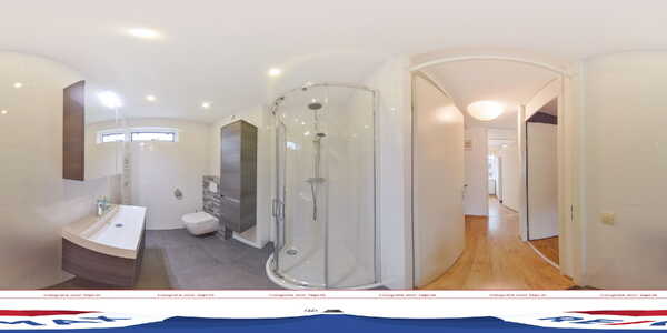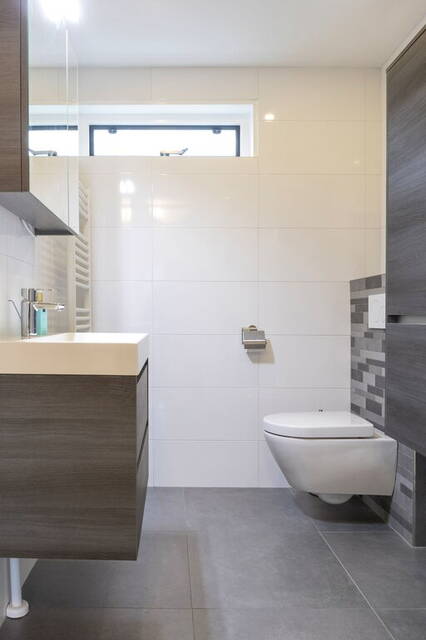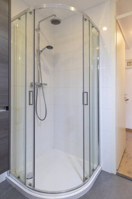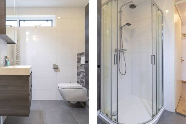 De moderne badkamer is ingedeeld met een kwartronde douche, tweede toilet, handdoekenradiator en een wastafelmeubel met spiegelkast. Mooie tegels op de wanden en vloer, inbouwverlichting en het sanitair zorgen voor de juiste uitstraling.
