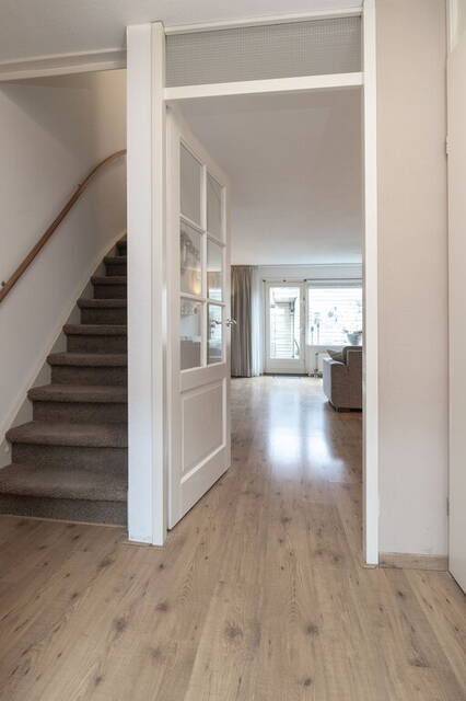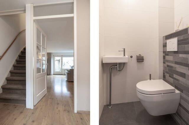 Kom binnen in deze prachtige woning en laat je verleiden door de charme en sfeer. Links in de hal is de moderne toiletruimte met fonteintje en aan de rechterzijde is de meterkast, onder andere voorzien van glasvezel. In de hal zie je dat deze woning zeer netjes wordt bewoond; de trap is bekleed met tapijt en de laminaatvloer met keurige plint ligt op nagenoeg de hele begane grondvloer.