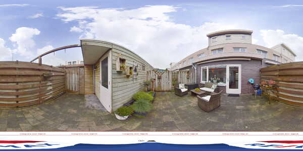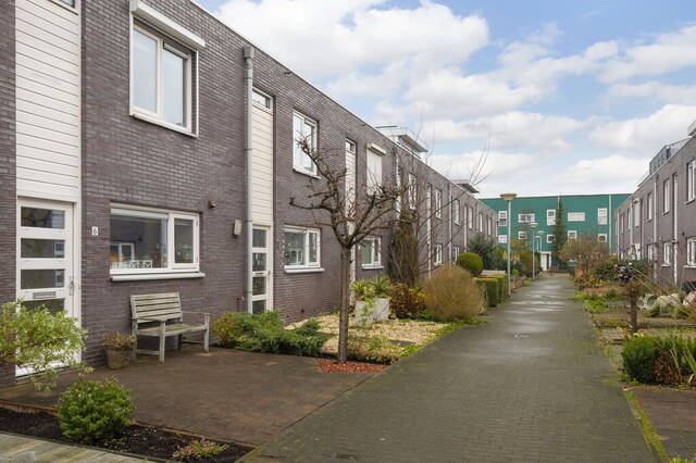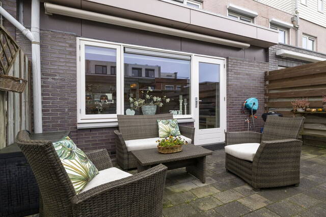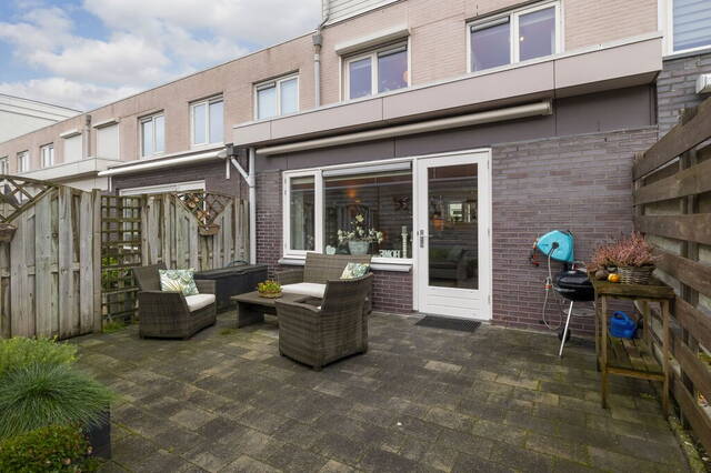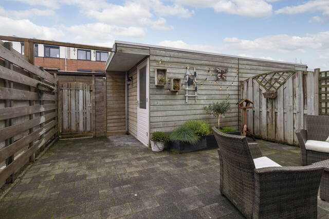 Vanuit de woonkamer is de achtertuin te bereiken, gelegen op het zuidoosten. Net als in de voortuin is er weinig onderhoud, zo heb je meer tijd om van de zon te genieten. In de houten berging is plek voor meerdere fietsen en via de houten poort kom je bij de gezamenlijke achterom. Tegen de achtergevel hangt een buitenkraan en de brede zonwering heeft elektrische bediening.