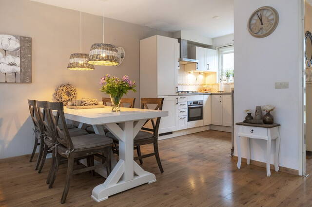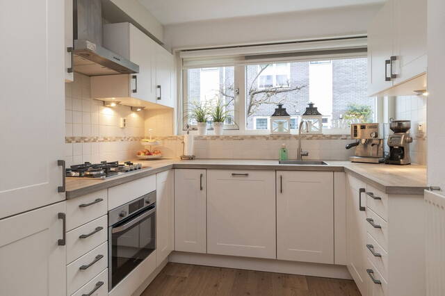 Aan de voorzijde is de mooie keuken welke grenst aan de zeer rustige straat. De U-vormige keukenopstelling heeft alle benodigde inbouwapparatuur: een gaskookplaat, afzuigkap, koelkast, vriezer, combi-oven en een vaatwasser. Zie jij jezelf hier al koken?